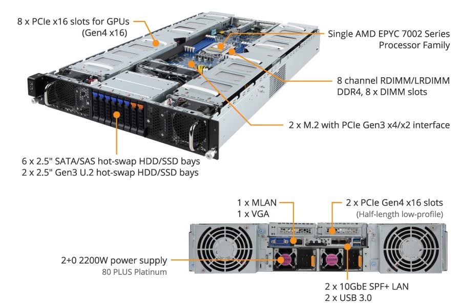 Gigabyte 2U 8Bays Single Processor AMD up to 8GPU Rackmount Server
