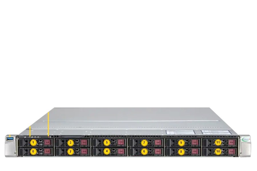 Default: Total 12 bay(s) 12 front hot-swap 2.5" NVMe*/SAS*/SATA* drive bay(s) (*NVMe/SAS/SATA support may require additional storage controller and/or cables, please see the optional parts list for details) M.2: 2 M.2 PCIe 5.0 x4 NVMe slot(s) (M-key 22110(default)/2280; VROC required for RAID) |
